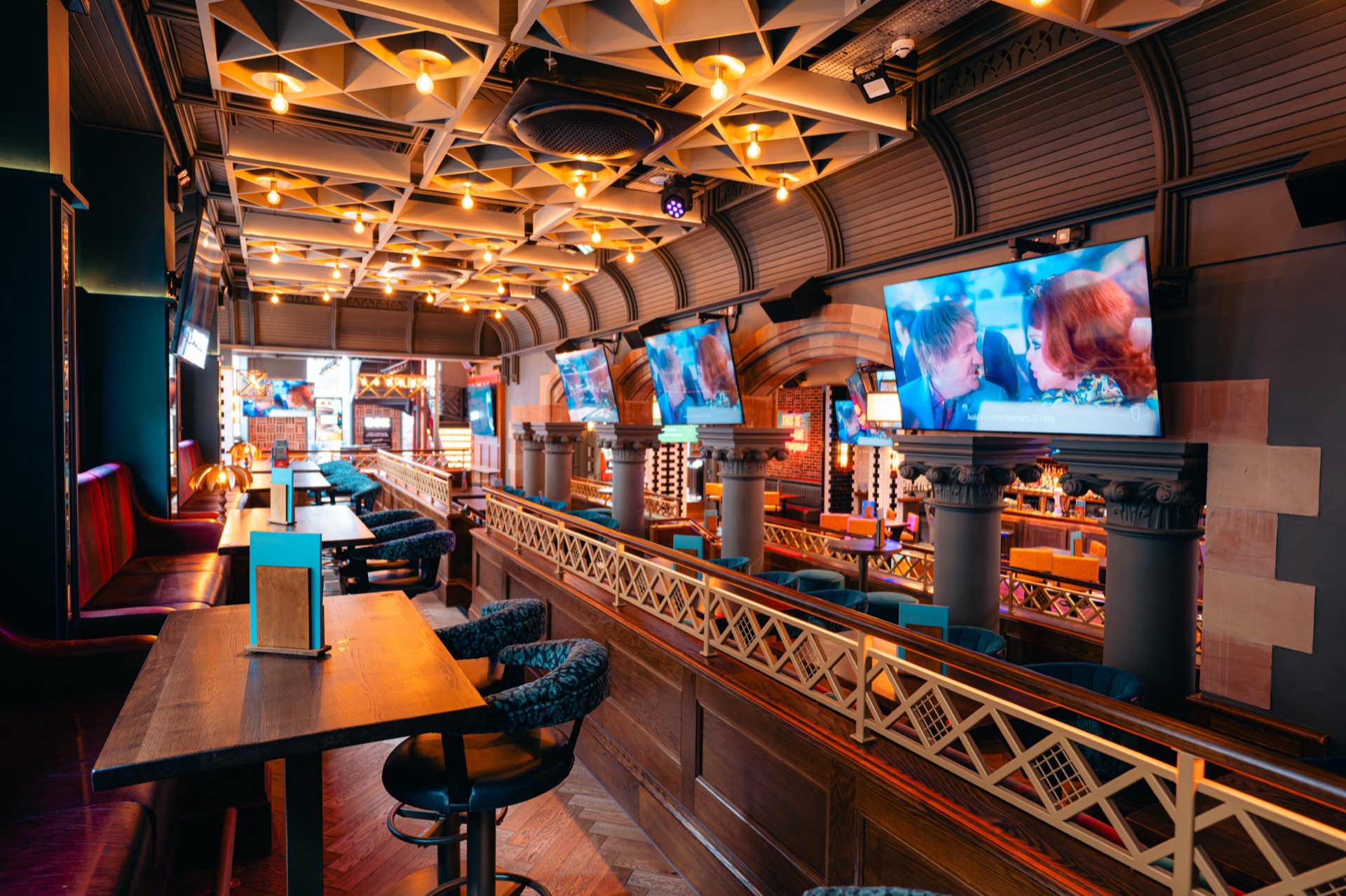 Commercial-grade displays and LED walls creating a dynamic visual experience across multiple zones within the listed building.