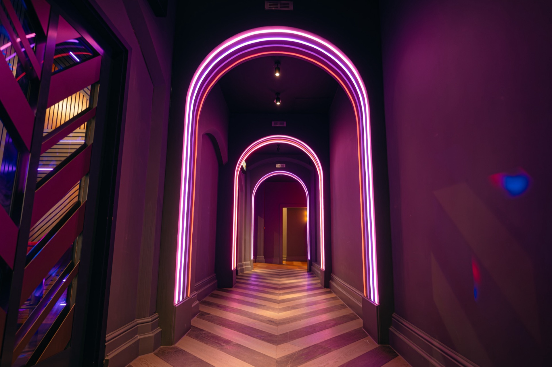 Integrated LED lighting enhancing the architectural features and setting the atmosphere for each area of the venue.