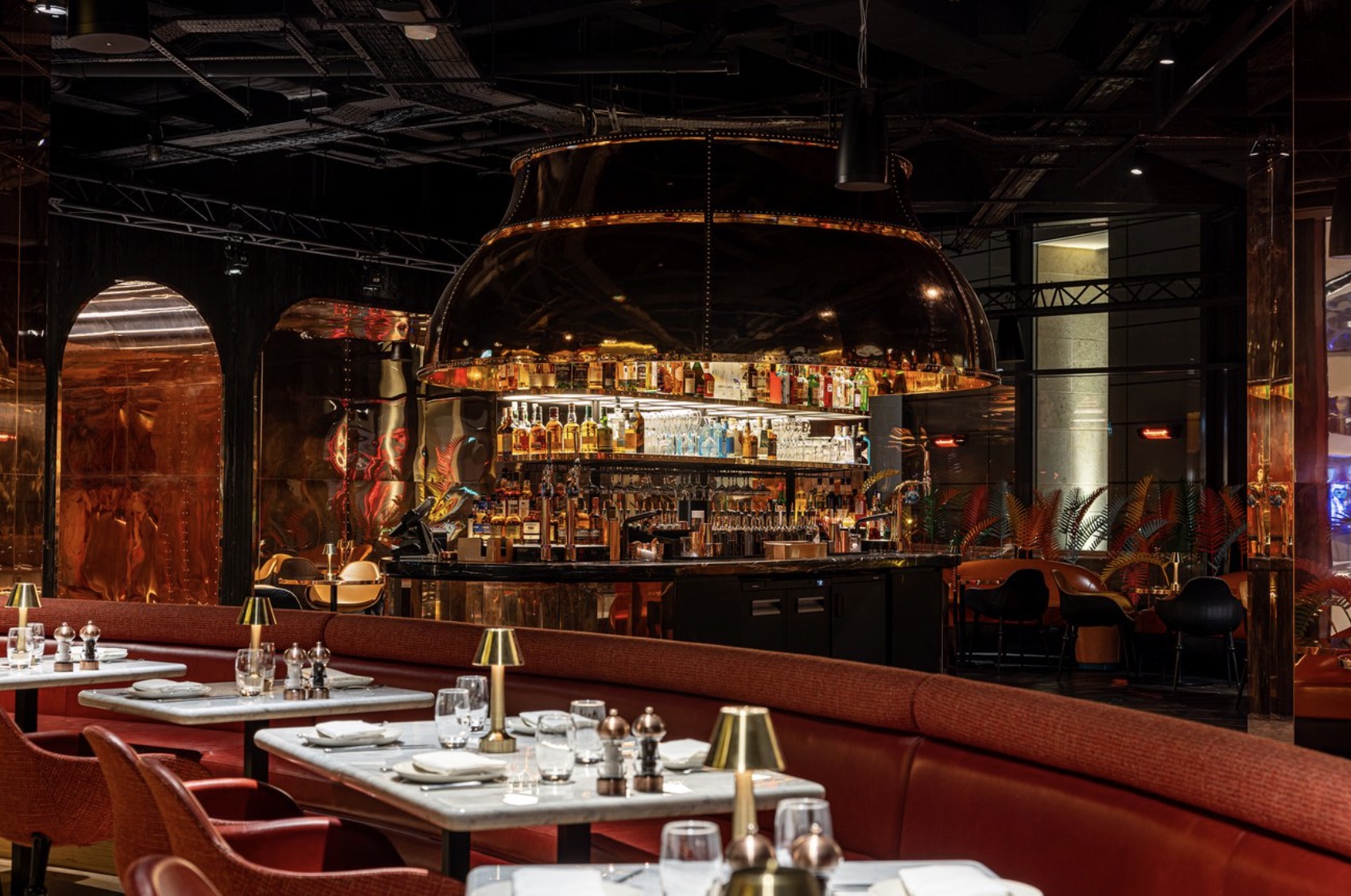 The design concept for Duck and Waffle Edinburgh centres on the idea of performance. Declan Cashen, working within Gardiner and Theobald's hospitality-specific fit-out team, describes the brief in vivid terms: the restaurant was conceived so that the kitchen becomes a stage, with the head chef standing at its centre. Lighting trusses, hanging speakers, and carefully positioned AV elements all converge on this focal point, creating an atmosphere more akin to a live concert than a conventional restaurant.