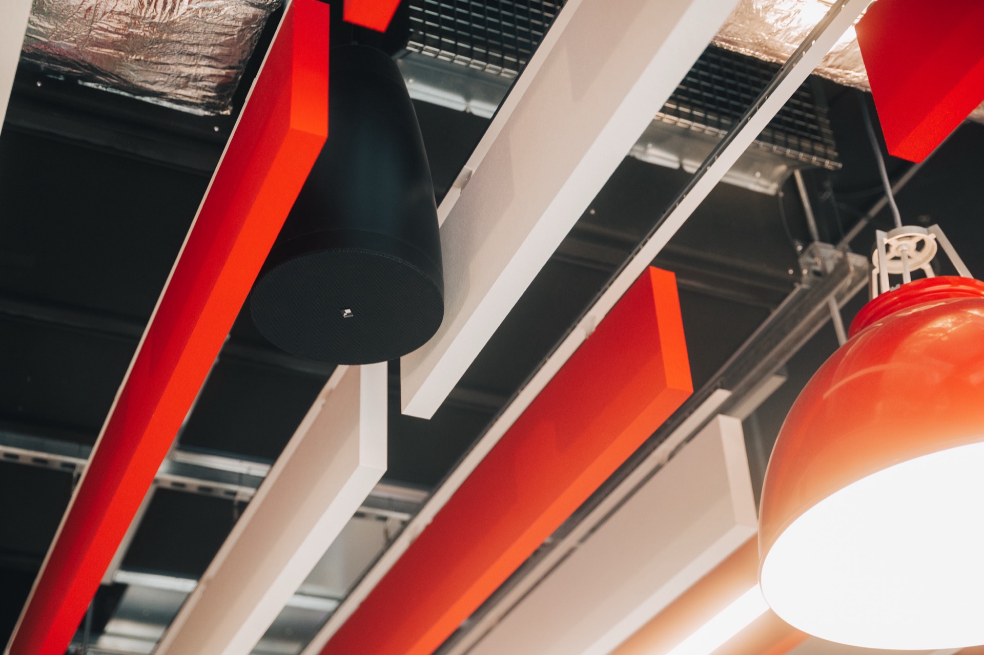 Pendant speakers delivering powerful, even coverage throughout the sports bar for an immersive match-day atmosphere.