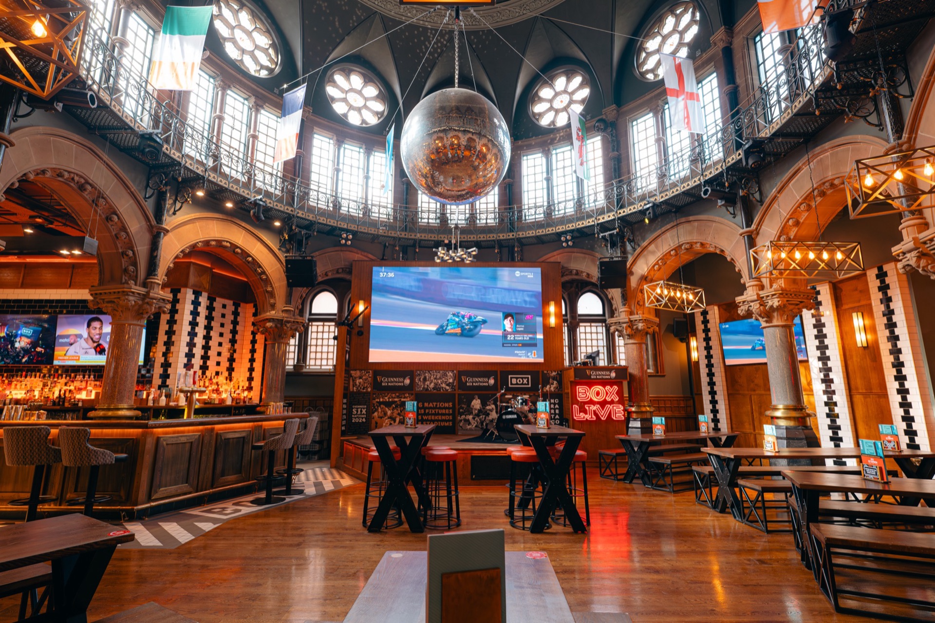Commercial-grade displays and LED walls creating a dynamic visual experience across multiple zones within the listed building.